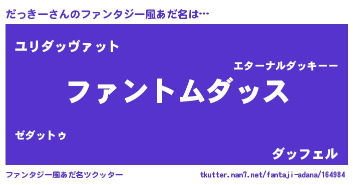 | 男性向けラノベタイトル風あだ名 | 『ダンジョンにだっきーを求めるのは間違っているだろうか』 |