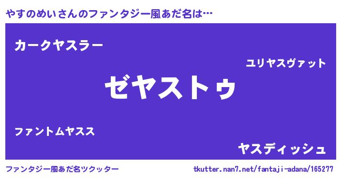 | 男性向けラノベタイトル風あだ名 | 『Re:やすのめいから始める異世界生活』 |