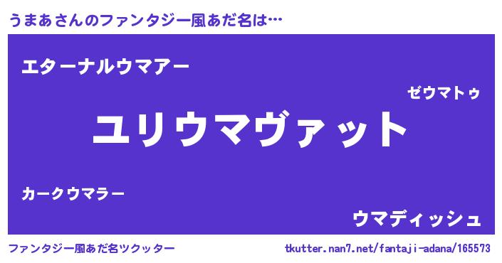 | 男性向けラノベタイトル風あだ名 | 『うまあ~年齢イコール彼女いない歴の魔法使い~』 |