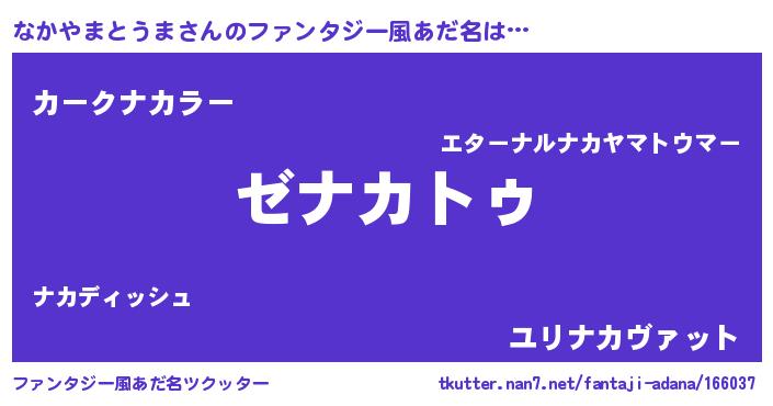 | 男性向けラノベタイトル風あだ名 | 『Re:なかやまとうまから始める異世界生活』 |