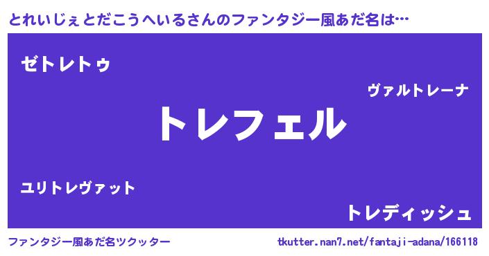 | 男性向けラノベタイトル風あだ名 | 『とれいじぇとだこうへいるの憂鬱』 |