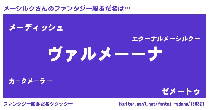| 男性向けラノベタイトル風あだ名 | 『魔弾の王とメーシルク』 |