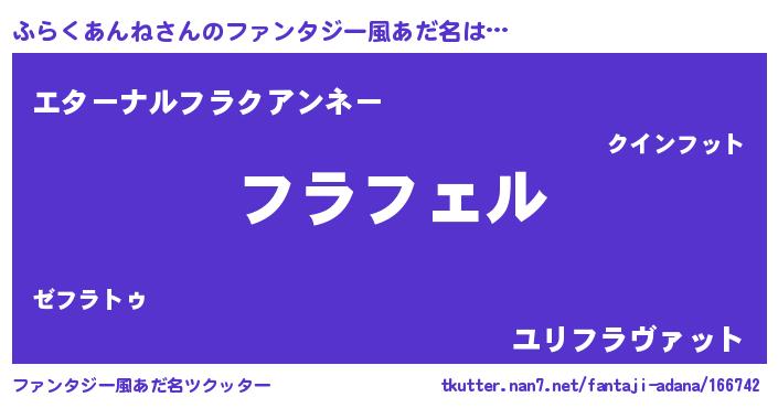 | 男性向けラノベタイトル風あだ名 | 『フラクアンネアートオンライン』 |