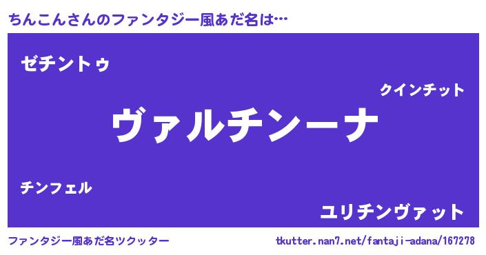 | 男性向けラノベタイトル風あだ名 | 『魔弾の王とちんこん』『ちんこんの憂鬱』 |