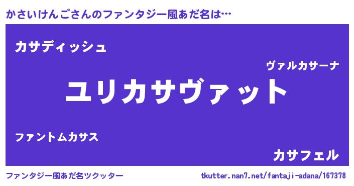 | 男性向けラノベタイトル風あだ名 | 『かさいけんご~年齢イコール彼女いない歴の魔法使い~』 |