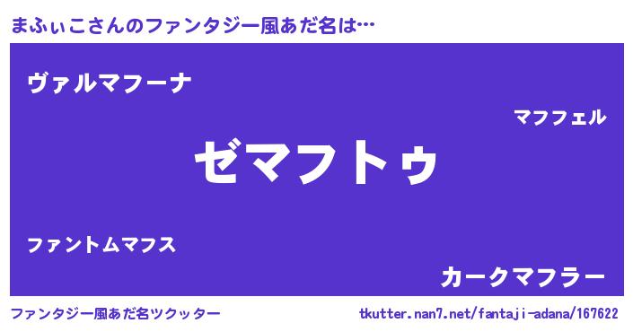 | 男性向けラノベタイトル風あだ名 | 『Re:まふぃこから始める異世界生活』 |