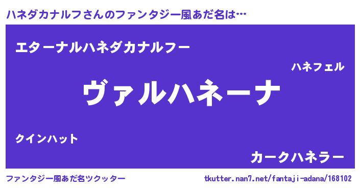 | 男性向けラノベタイトル風あだ名 | 『この素晴らしい世界にハネダカナルフを!』 |