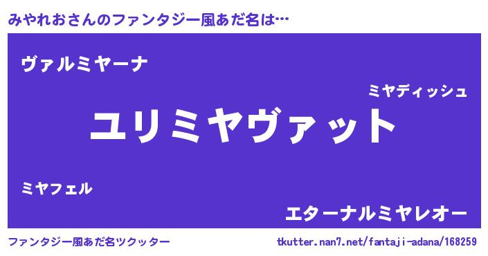 | 男性向けラノベタイトル風あだ名 | 『ミヤレオスレイヤー』 |