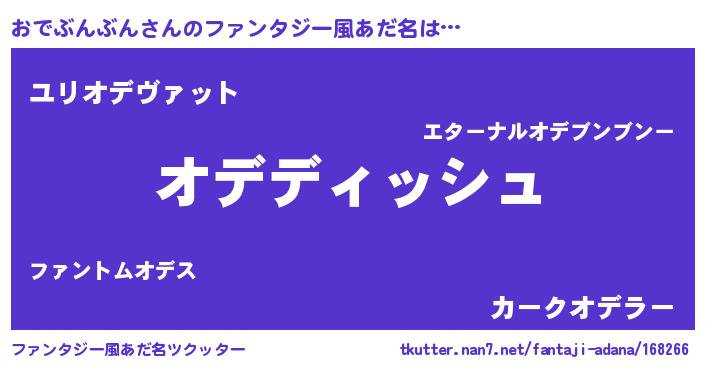 | 男性向けラノベタイトル風あだ名 | 『おでぶんぶんという概念が存在しない退屈な世界 』 |