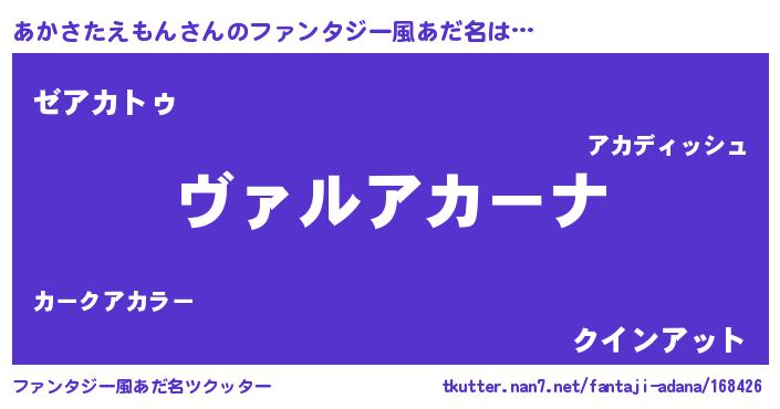 | 男性向けラノベタイトル風あだ名 | 『魔弾の王とあかさたえもん』 |