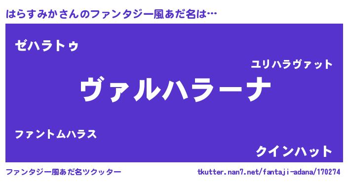 | 男性向けラノベタイトル風あだ名 | 『魔弾の王とはらすみか』 |