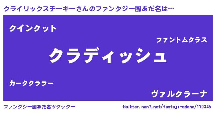 | 男性向けラノベタイトル風あだ名 | 『クライリックスチーキーという概念が存在しない退屈な世界 』 |