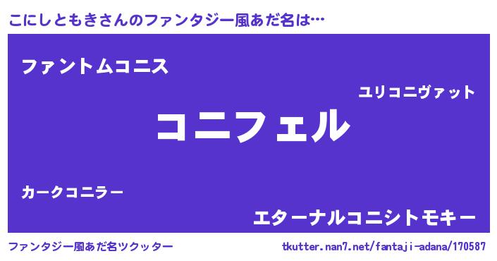 | 女子向けラノベタイトル風あだ名 | 『こにしともき姫と円卓の騎士』 |