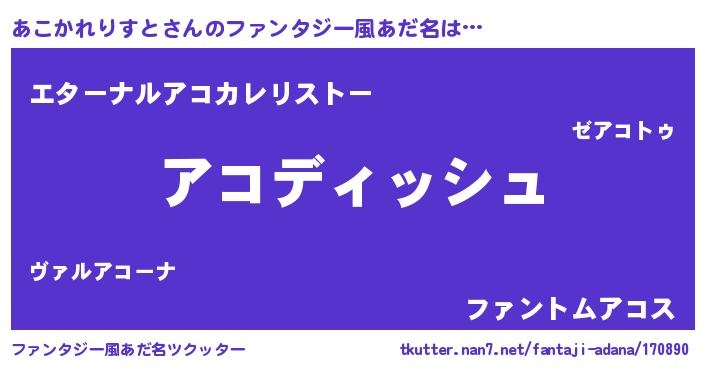 | 胡散臭い通販商品みたいなあだ名 | 『来世でも幸せになれる水素水…その名も「あこかれりすと」』 |