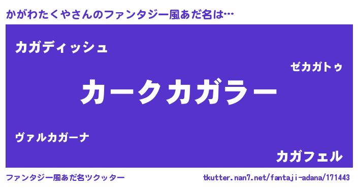 | ヘコむあだ名 | 『かがわたくや(遠い目)』『かがっふぃ~』 |