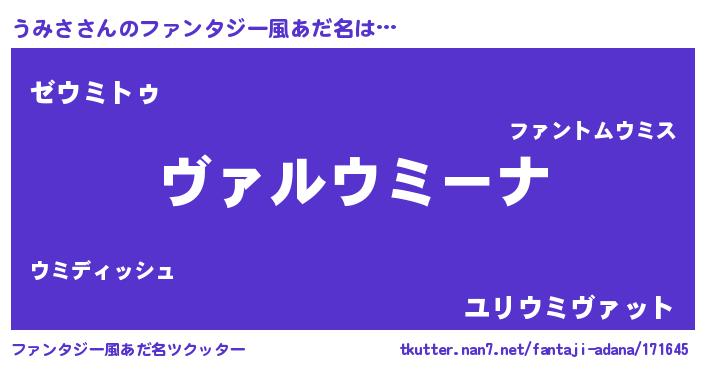 | 男性向けラノベタイトル風あだ名 | 『魔弾の王とうみさ』『ウミサスレイヤー』 |