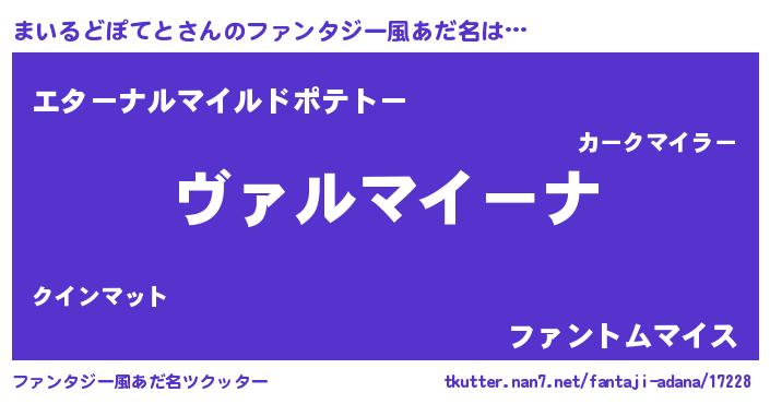 | 男性向けラノベタイトル風あだ名 | 『この素晴らしい世界にまいるどぽてとを!』 |