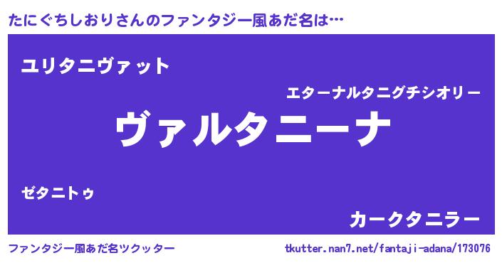 | 男性向けラノベタイトル風あだ名 | 『魔弾の王とたにぐちしおり』 |