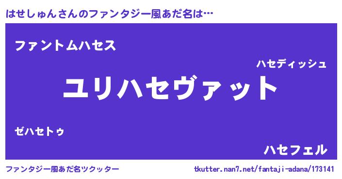 | 男性向けラノベタイトル風あだ名 | 『はせしゅん~年齢イコール彼女いない歴の魔法使い~』 |