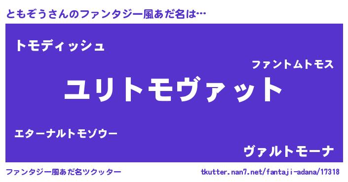 | 男性向けラノベタイトル風あだ名 | 『ともぞう~年齢イコール彼女いない歴の魔法使い~』 |