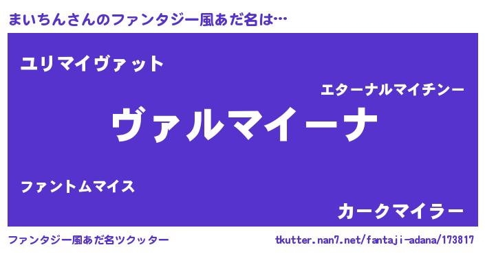 | 女子向けラノベタイトル風あだ名 | 『乙女ゲームの破滅フラグしかない悪役まいちんに転生してしまった…』 |