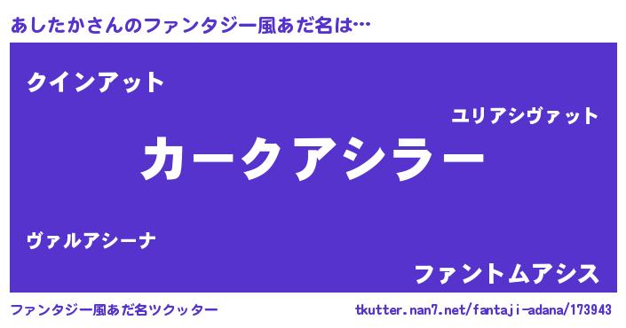 | 男性向けラノベタイトル風あだ名 | 『緋弾のアシタカ』『魔弾の王とあしたか』 |