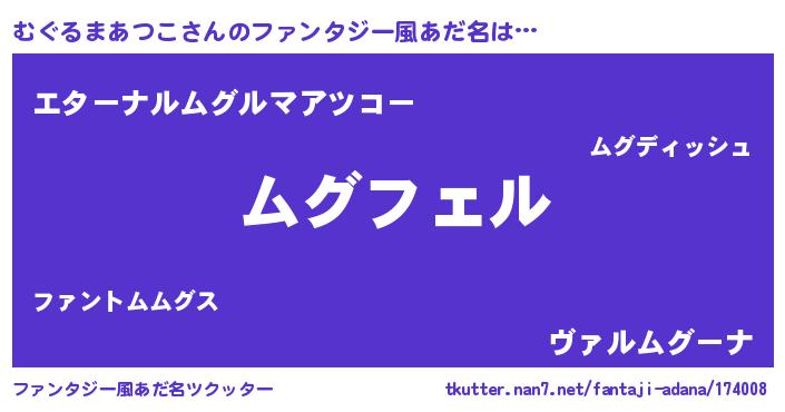 | 女子向けラノベタイトル風あだ名 | 『むぐるまあつこ姫と円卓の騎士』 |