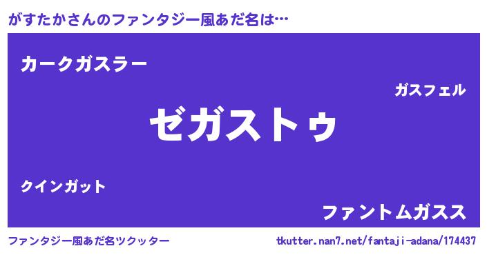 | 男性向けラノベタイトル風あだ名 | 『Re:がすたかから始める異世界生活』 |