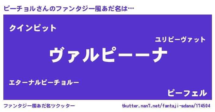 | 男性向けラノベタイトル風あだ名 | 『魔弾の王とピーチョル』 |