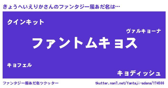 | ヘコむあだ名 | 『きょぷりん』『きょうへいえりか(小並感)』 |