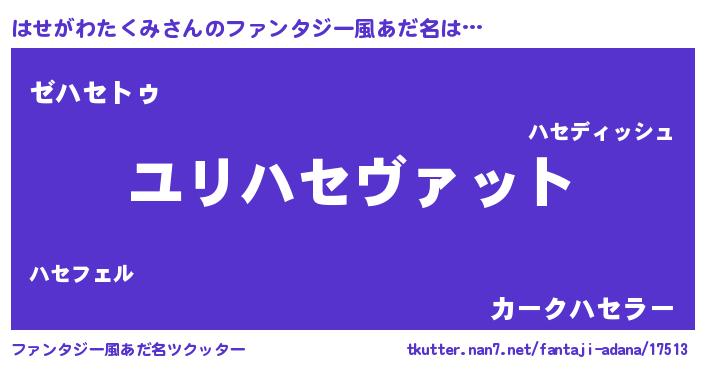 | 男性向けラノベタイトル風あだ名 | 『ハセガワタクミスレイヤー』 |