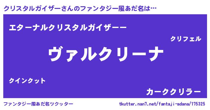 | 女子向けラノベタイトル風あだ名 | 『悪役クリスタルガイザーに転生したようですが、知った事ではありません』 |