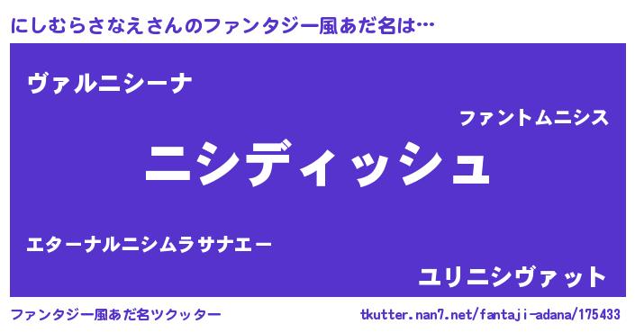 | ヘコむあだ名 | 『にしむらさなえ(小並感)』『にしっちょ』 |