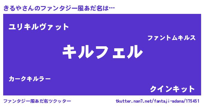 | 男性向けラノベタイトル風あだ名 | 『きるやの憂鬱』 |