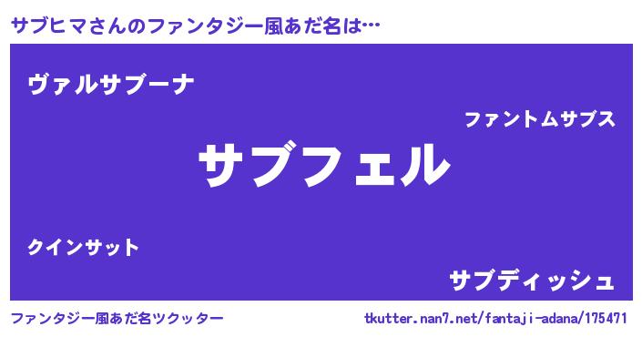 | 男性向けラノベタイトル風あだ名 | 『サブヒマの憂鬱』『魔弾の王とサブヒマ』 |