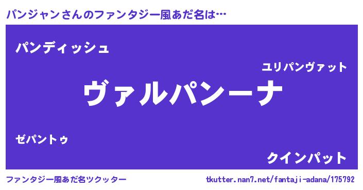 | 男性向けラノベタイトル風あだ名 | 『魔弾の王とパンジャン』 |