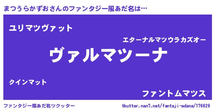 | 男性向けラノベタイトル風あだ名 | 『魔弾の王とまつうらかずお』 |