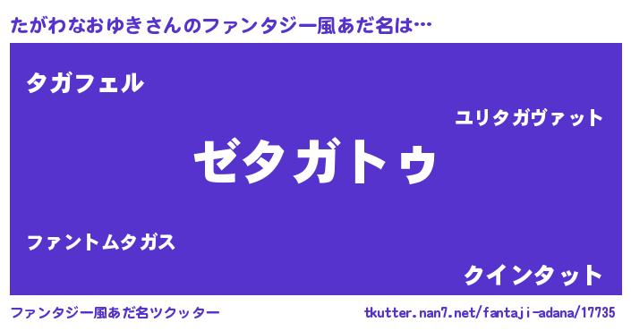 | 男性向けラノベタイトル風あだ名 | 『Re:たがわなおゆきから始める異世界生活』 |
