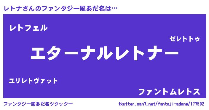 | 男性向けラノベタイトル風あだ名 | 『レトナに滅ぼされるだけの簡単なお仕事です』 |