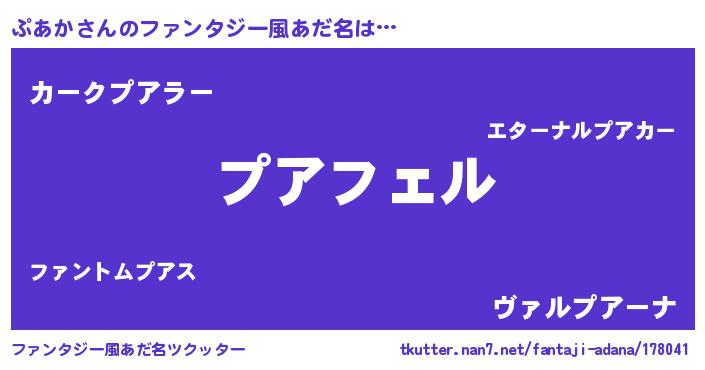 | 男性向けラノベタイトル風あだ名 | 『ぷあかの憂鬱』『はたらくぷあかさま!』 |