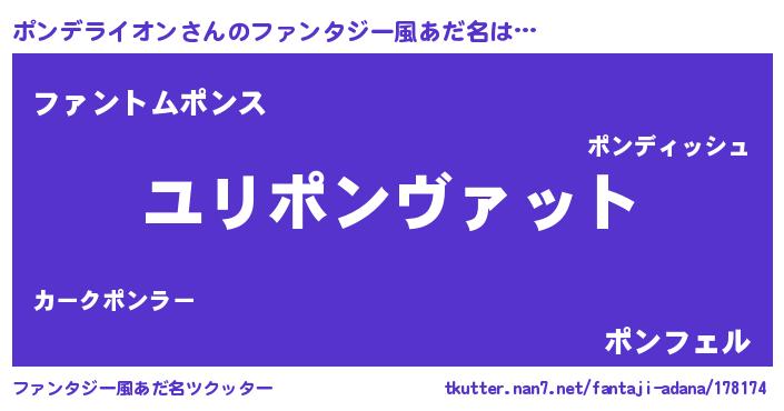 | 男性向けラノベタイトル風あだ名 | 『ポンデライオン~年齢イコール彼女いない歴の魔法使い~』 |