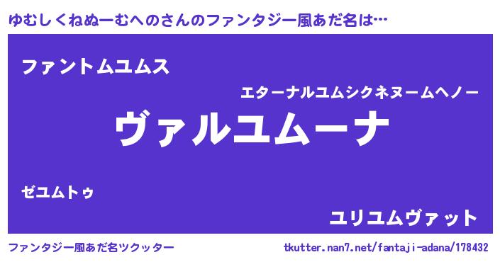 | 男性向けラノベタイトル風あだ名 | 『この素晴らしい世界にゆむしくねぬーむへのを!』 |