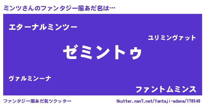 | 男性向けラノベタイトル風あだ名 | 『Re:ミンツから始める異世界生活』 |