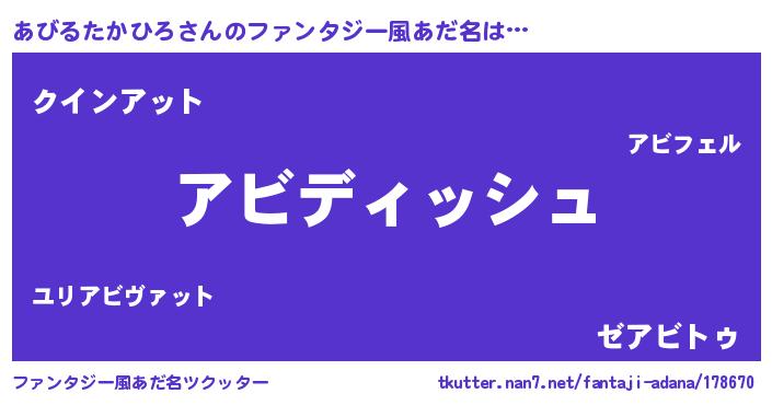 | 男性向けラノベタイトル風あだ名 | 『あびるたかひろという概念が存在しない退屈な世界 』 |