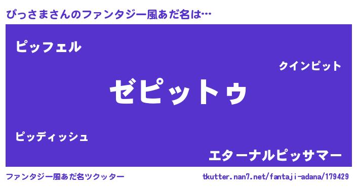 | 男性向けラノベタイトル風あだ名 | 『Re:ぴっさまから始める異世界生活』 |