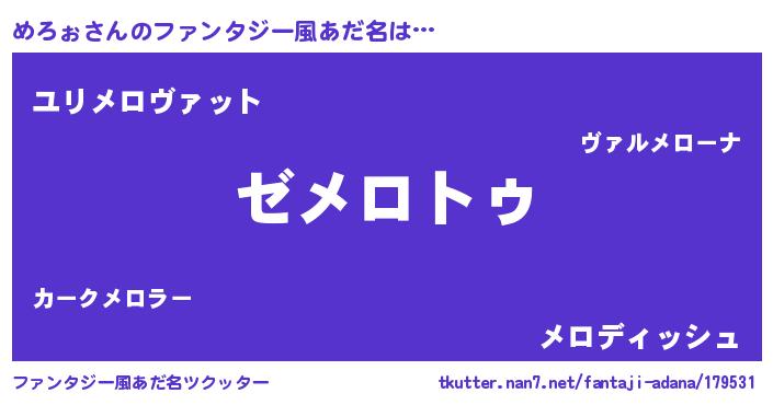 | 男性向けラノベタイトル風あだ名 | 『Re:めろぉから始める異世界生活』 |
