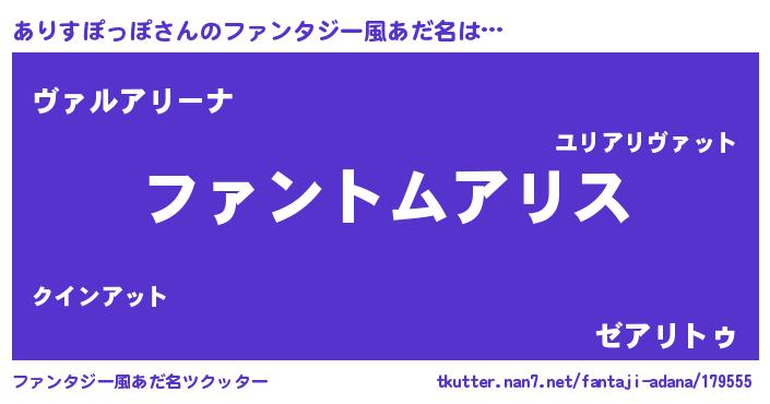 | 男性向けラノベタイトル風あだ名 | 『ダンジョンにありすぽっぽを求めるのは間違っているだろうか』 |