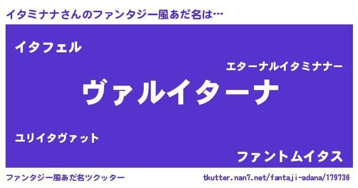 | 男性向けラノベタイトル風あだ名 | 『この素晴らしい世界にイタミナナを!』 |