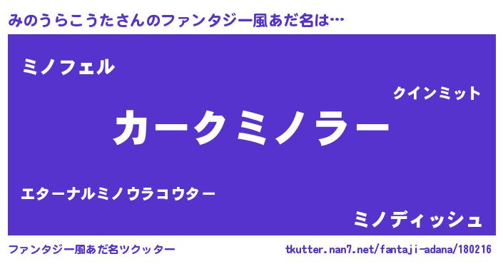 | 男性向けラノベタイトル風あだ名 | 『うちのみのうらこうたが世界を掌握している!』 |
