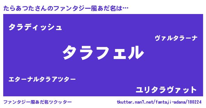 | 男性向けラノベタイトル風あだ名 | 『たらあつたの憂鬱』 |